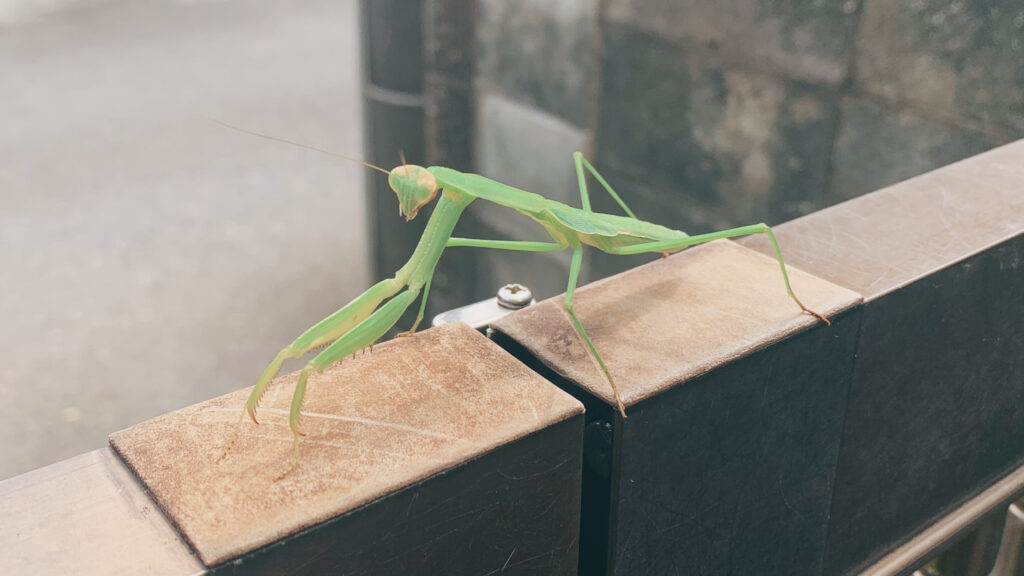 7月6日(日)。食料品の買い出しに行こうとしたら、家の門のちょうど真ん中にカマキリが乗っていて目が合いました。黒光りする昆虫は苦手ですが、バッタやカマキリの緑色はキレイだと思います。