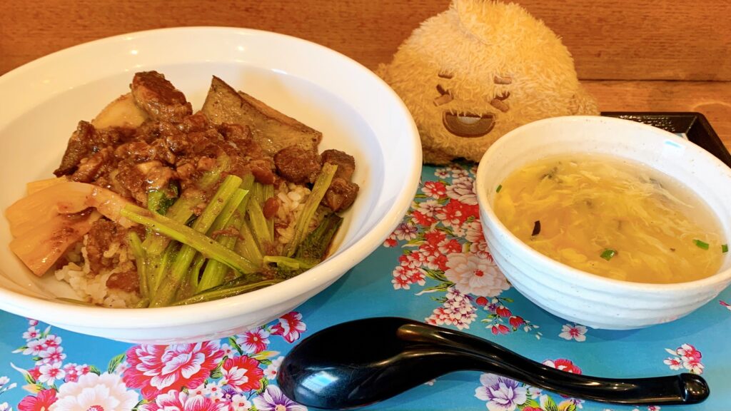 7月18日(金)。職場の新人研修をひとりで頑張っているご褒美に、滷肉飯(ルーローハン)のお店を再訪しました。去年より値上がりしてましたがそれでも安い《滷肉飯スープ付きセット》1010円、《台湾カステラ》ハーフサイズ450円を注文。八角などのスパイス香る甘辛な豚バラの角煮、食感が楽しい太いメンマ、栄養価的にも有り難い小松菜炒めと、半熟卵がまるまる一個。角煮と同じタレが滲みた厚揚げが不思議というか量増しかな?と思いつつ、これはこれで美味しかったので全然オケ(o^-‘)bグッ
