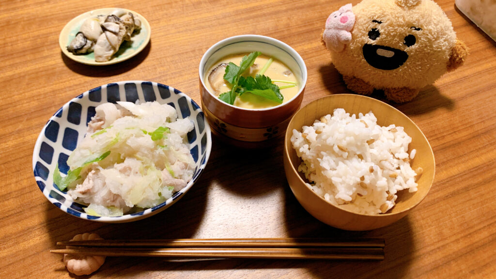 夕飯は少しでも体調が回復するように、大根と豚肉と長ねぎのシンプルな《みぞれ鍋》に茶碗蒸しを作りました。誕生日なのに薬膳みたいな食事で笑えますが、あまり食欲もないみたい(´・ω・`)シュン