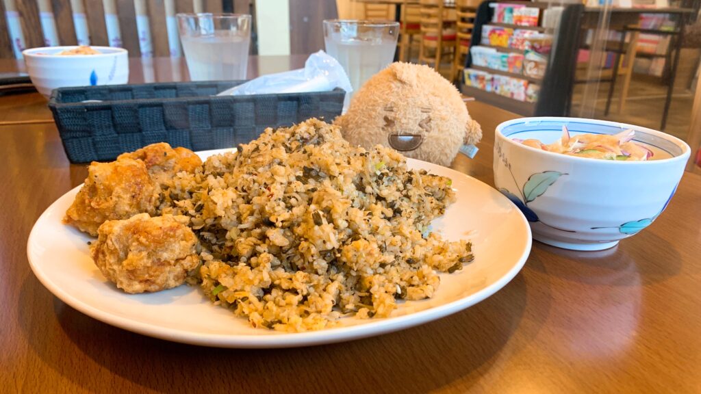 11月28日(金)。母との月末ランチの日。先月は臨時休業だったお店をリベンジ。豊富なメニューから《紫蘇の実としらすの炒飯:からあげ付き》1050円を注文しました。店主さんが一人で作っていて提供に時間がかかるとの注意書きがありましたが、テーブルで待つのは苦じゃありません。料理が運ばれてきて、お皿の大きさにびっくり。想像の1.5〜2倍くらいご飯が山盛りでした(о゚д゚о)ホワー