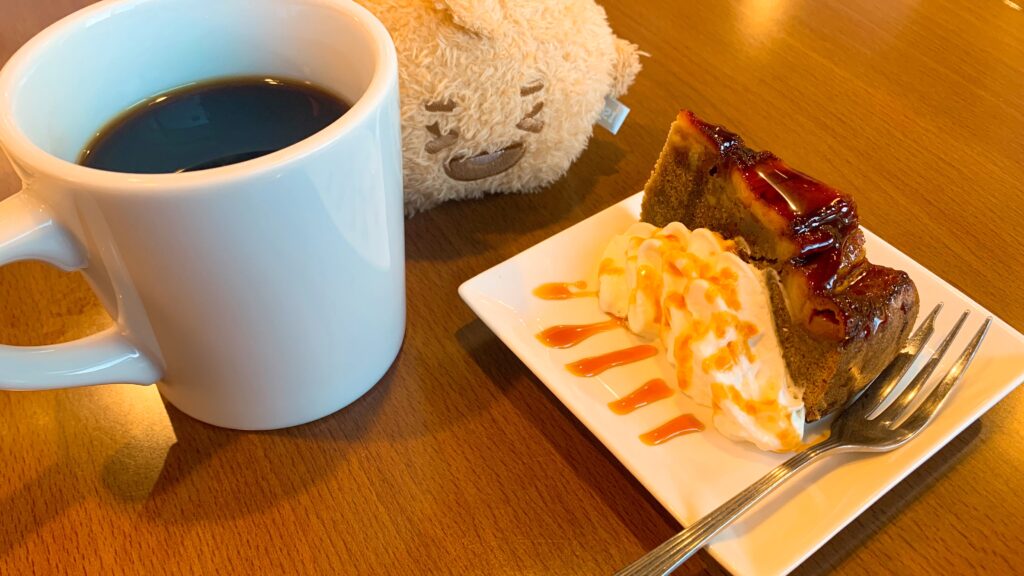 たとえ満腹でも食後のデザートとお茶は別腹です。《キャラメルバナナ珈琲ケーキ》は甘さ控えめビタータイプ、ブレンドは淹れたて熱々でたっぷり飲めて嬉しかったです。