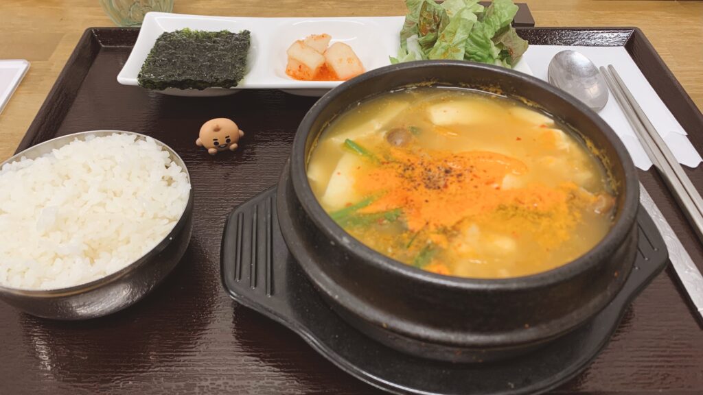 というわけでセンイルにかこつけて、個人経営の韓国料理屋さんでランチしました。やや清潔感が足りないものの、白を基調にした可愛らしい店内。K-POPのMVを映すモニターは、なぜかヨジャグルのみ流れます。厨房に背を向けた壁際のカウンター席を選んで、《スンドゥブチゲセット》980円を注文しました。
