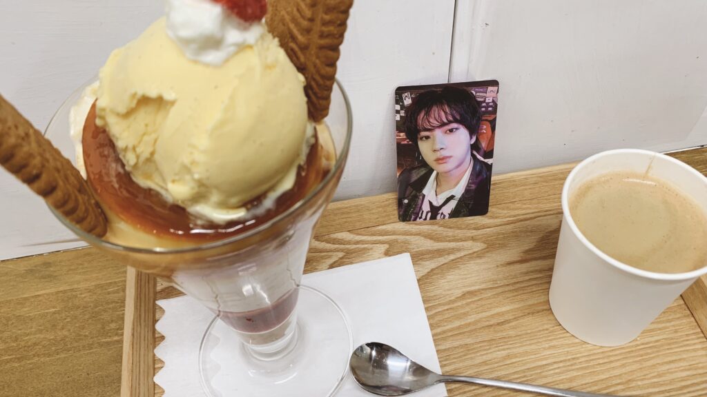 熱々のスープに少し舌を火傷したせいか、ケーキと迷いながらも《プリンパフェ》750円を追加して、あらためてお祝い。バニラビーンズが入ったアイスに大好きなロータスビスケット、固めのプリン、底にはイチゴソースとコーンフレーク。市販品を盛りつけただけかもしれませんが、新大久保のお店もファミレスもおそらくそんなもんなので構いません。濃厚な甘さに満たされました。無料で付いてくる珈琲の量だけが残念だったので、店を出てすぐコンビニに寄りましたが(°∀°)テヘ