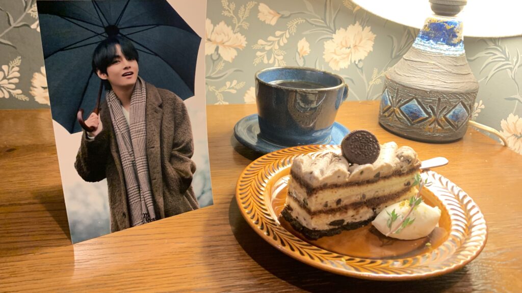 12月30日(火)。BTSのVことテヒョンくん、お誕生日おめでとうございます。【BLACK HOLE】の柳下毅一郎さんのバースデーでもあります。共通点はなにかあるかな……まったく思いつかないな。《クッキー&クリームのティラミスケーキ》と珈琲でお祝い。食器と照明の雰囲気がなんとなくテテちゃんぽくて、この店にして正解でした。年内最後のティータイムを素敵に過ごせました(*´꒳`*ノノ゙パチパチ