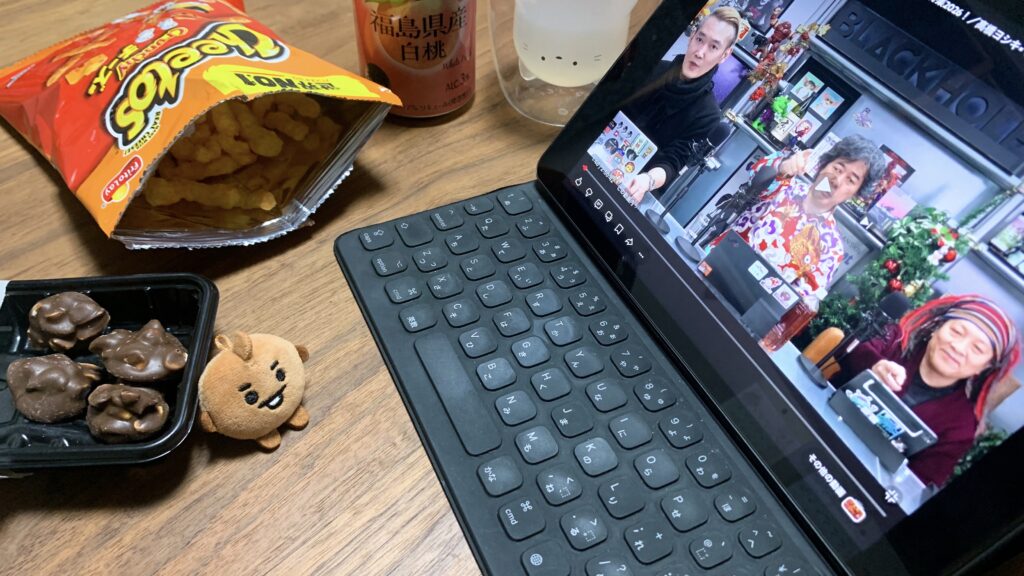 1月3日(土)。夜のあいだに初雪が降ったらしい、新年早々の初出勤日。【BLACK HOLE】新年会が17時からで慌てて帰宅。リンチ監督が好きな《チートス》に、でん六のピーナツチョコと福島の桃チューハイを開けて見始めたものの、仕事のあとは酔いやすいのか単純に疲れているからか、アルコール3%で早々に眠くなってしまったのでした( ˘ω˘ )スヤァ