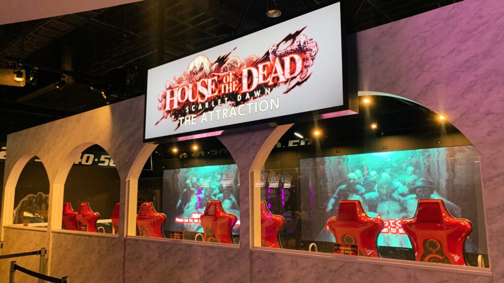 マナティーの映像が気味の悪いラウンジで小休憩。チリドッグとスプライトでエネルギー補給したあとは、《ハウス・オブ・ザ・デッド》に向かいました。シリーズ最新作といわれても分かりませんが、その名のとおりゾンビもののガンシューティングゲームです。ハウスというより城だったり、ゾンビの造形のバリエーションが少なくて寂しかったり、巨大ロボットが出てきて戸惑ったりしましたが、ライフルを撃ちながら座席がガタガタするのは楽しい((*’ω’*))グラグラ
