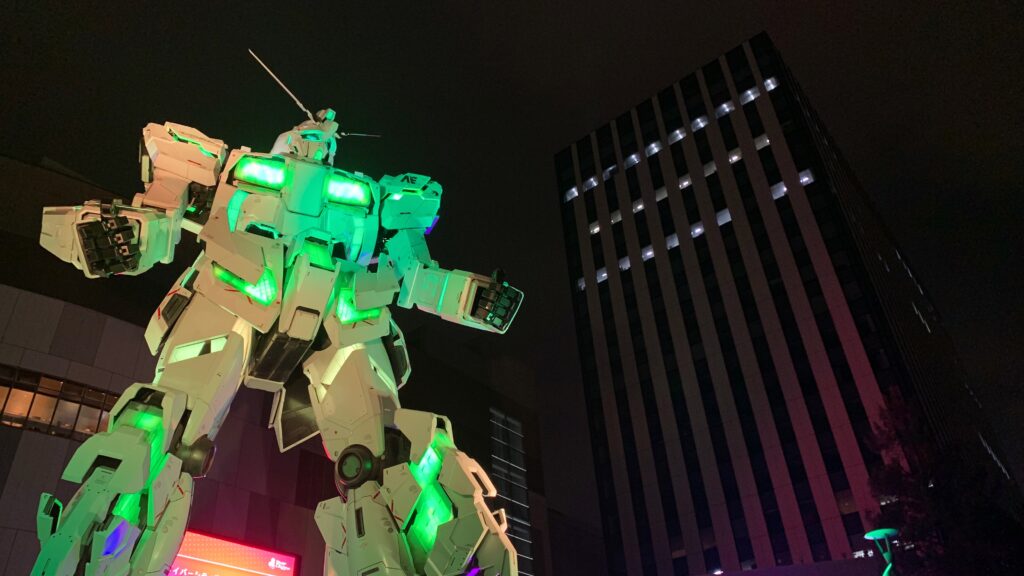 幸いにも雪は降っておらず午前に感じた冷たい風もやんでいて、外を歩くのは苦ではありませんでした。そうしてお台場の夜空の下に現れた《ユニコーンガンダム》。『機動戦士ガンダムUC』を観ていないので造形をまったく知らず、真っ白なボディに素で驚きました。ガンダムは兵器のくせになんでトリコロールカラーなんだ、という批判は昔からありましたが、それを踏まえてのカラーリングなんでしょうか。めっちゃカッコイイ(*°▽°*)キューン