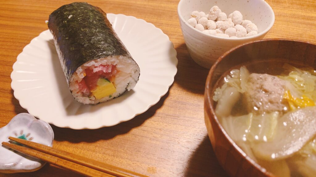 2月3日(火)。昨日仕込んだ《いわしのつみれ汁》と試しに買ってみた《海鮮恵方巻き》で節分ディナー。まぐろにサーモン、海老にイカ、卵などの具が盛り盛りで美味しかったです。来年は予約してもいいかもしれない(*˙ㅂ˙*)モグモグモグ